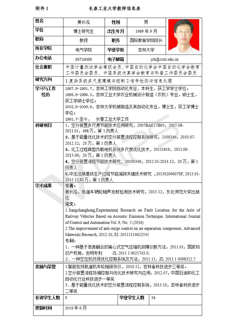 姜长泓教授,博士,现为长春工业大学学科带头人,国际教育新澳彩开奖直播 院长;长期工作在教学、科研一线,1996年任讲师,2001年任副教授,2004年破格晋升教授;吉林省第八届青年科技奖获得者、国家科技支撑计划课题负责人、吉林省第四批拔尖创新人才(第三层次)、长春市第五批有突出贡献专家、长春市第二届“百名优秀科技工作者”。目前担任中国自动化学会中国自动化学会教育工作委员会委员、中国系统仿真学会教育与科普工作委员会委员、中国计量测试学会高级会员。