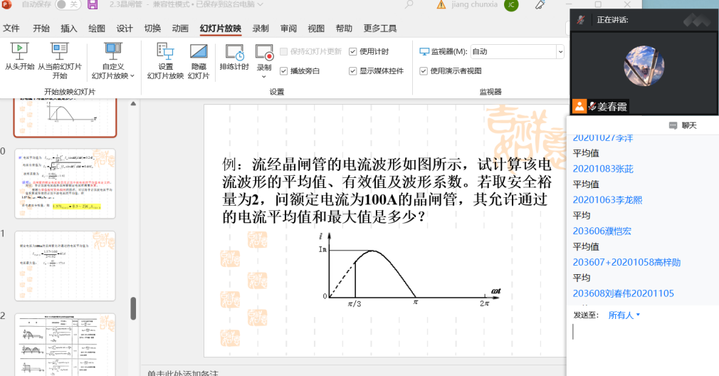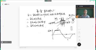 姜春霞老师讲授的“电力电子技术”课程线上教学采用腾讯会议(屏幕共享)+学习通平台相结合的教学方式;每小节上课前播放上课铃声,增加仪式感;课堂教学采用上课前提问、总结上节课知识点,讲课过程随机提问等方式,与学生互动,活跃线上课堂气氛;融入思政元素,例如:播放课程应用的相关视频,提生学生学好这门课的兴趣;缅怀教材的作者,学习大师精神,并将大师的生平资料上传学习通资料库。采用学习通软件课堂随机点名,了解学生的在线情况;在学习通建立题库、作业库等;按课程进度定期向学生发放作业,定期发放讨论题目,调动学生参与课程的积极性;将签到、在线学习课件和参与讨论等按比例计入平时成绩。