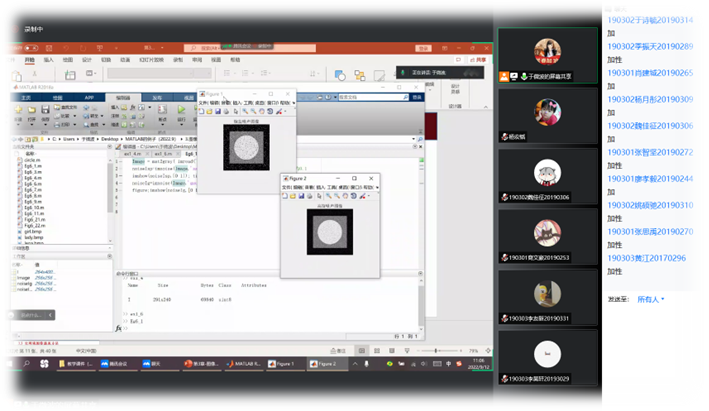 于微波老师的“数字图像处理与机器视觉”课程,利用腾讯会议进行线上授课,并形成课程视频录制,便于学生课下观看复习。课堂上,于老师通过签到、点名提问、讨论区互动、算法仿真实验等形式,及时了解学生听课状态。PPT课件与算法仿真实验验证有机结合,使得线上课堂如线下一样精彩。