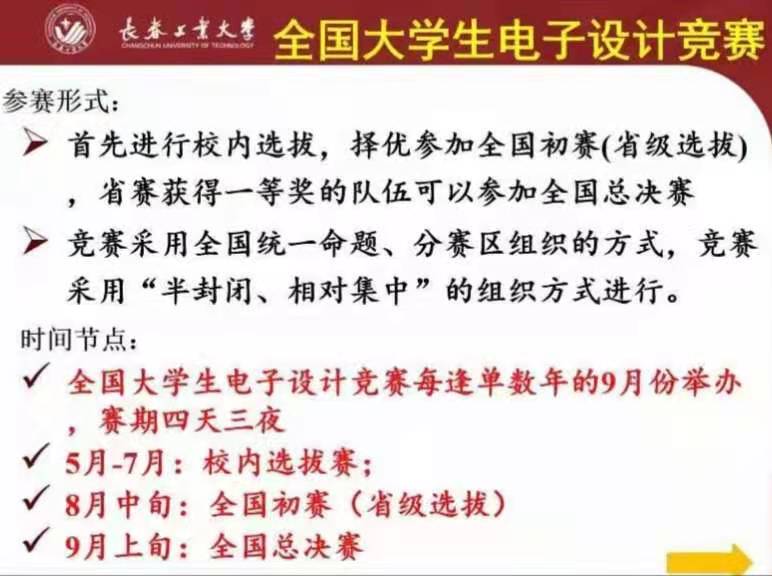 全国大学生电子设计竞赛是教育部倡导的大学生学科竞赛之一,是面向大学生的群众性科技活动,目的在于推动高等学校促进信息与电子类学科课程体系和课程内容的改革,有助于高等学校实施素质教育,培养大学生的实践创新意识与基本能力、团队协作的人文精神和理论联系实际的学风;有助于学生工程实践素质的培养、提高学生针对实际问题进行电子设计制作的能力;有助于吸引、鼓励广大青年学生踊跃参加课外科技活动,为优秀人才的脱颖而出创造条件。