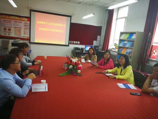 303会议室,我院党委书记王丽娜、院长韩顺杰、党委副书记矫东海、副院长刘帅师、研究生辅导员李昆、研究生秘书张雪峰等人接待了圣邦微电子(北京)股份有限公司人力资源、测试工程师一行三人。会议首先就贵公司的用人需求与我院研究生的培养、就业去向等方向展开了研讨。