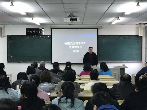 党委委员、院长助理董博为全体教师宣讲消防知识并回顾了多起近几年校园火灾事故的案例。