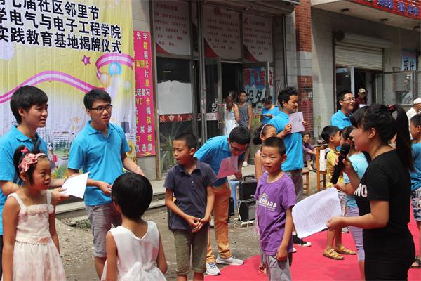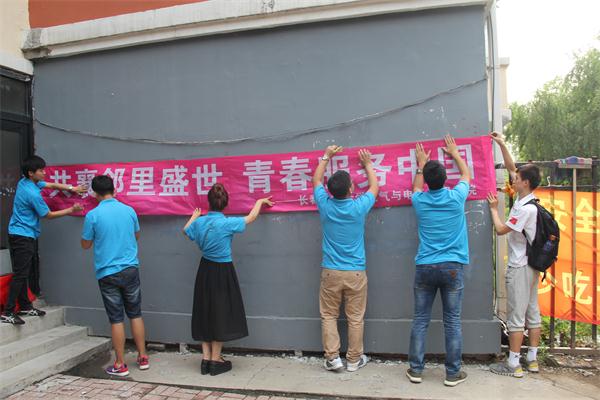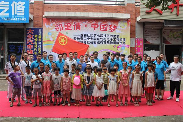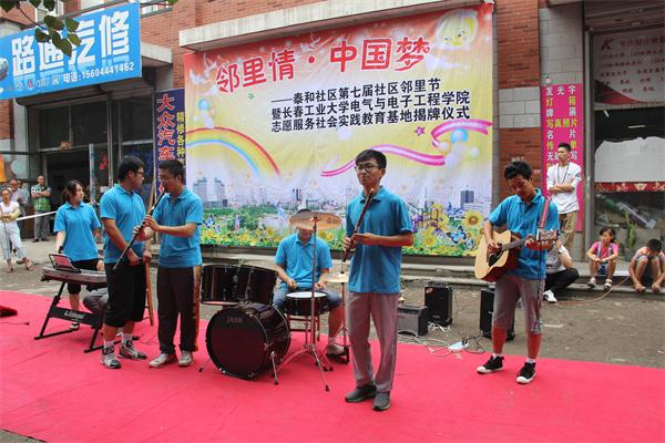 的大学生志愿者们融入社区当中,与社区举行“邻里情·中国梦——泰和社区第七届社区邻里节”暨长春工业大学大学生志愿服务社会实践基地揭牌仪式。