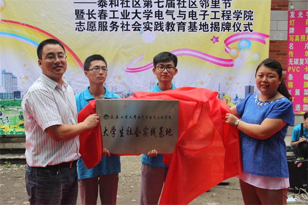 团委书记赵爽希望大学生志愿者们在实践活动中本着“受教育、长才干、做贡献”的原则,发挥好大学生的优势,结合居民的切身需要,对社区的建设做出自己的贡献;二道区泰和社区党总支副书记陈丽,在表达对志愿者的热烈欢迎的同时,深切表达了自己对泰和社区居民的祝福和期望。双方并为实践基地揭牌。
