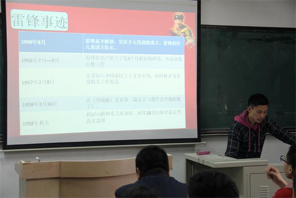 本次理论学习活动由120301班陈井贺同学主讲。首先他以音乐的形式向同学们传递雷锋精神的正能量,并讲述了雷锋同志的相关事迹。在座同学积极发言,表达自己的感受。在“新闻速递”环节中,主持人与在场各位一同回顾了上月里国内外发生的各类重大新闻事件,并和同学们一起就此展开讨论。最后,郑洪斌做总结,他告诫在座的学生干部,一定要认真的加强理论学习意识,提升自身思想道德水平,为同学做出积极向上的表率。  通过本次活动,同学们提出了自己不同的见解,并对事件发生的本质原因有所感受。这不仅锻炼了同学们独立思考的能力,更是以真实的事件使同学们得到思想上的教育。 |