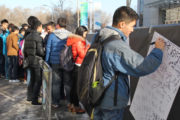 为了让更多的人感受到关爱,活动主要有两环节组成:第一环节是写下对他人的问候,对老师领导的问候、对父母家人的问候、对未来自己的问候等。同学们停止了脚步,纷纷在留言板上留言问候,期间赠送每位写问候的同学一杯热腾腾的豆浆,送上冬日里的一份温暖,现场还有抽奖活动,场面十分火爆。第二环节在南湖公园进行的“say hello”活动,向过往的游园市民友好问候。虽然大家警惕性较高,但还是得到市民们不错的回应。
