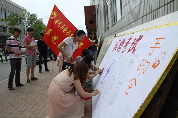 举办了诚信考试主题教育系列活动。 系列活动之一:诚信考试手印会 5月28日中午,党员先锋队在我校南湖校区食堂门口举办了诚信考试手印会。通过前期宣传,手印会现场,志愿者们向同学们宣传诚信考试,其他兄弟院校同学们也都积极参加本次活动,鲜红的手印印满了诚信考试的宣传板,也证明了同学们关于诚信考试的承诺和信心。