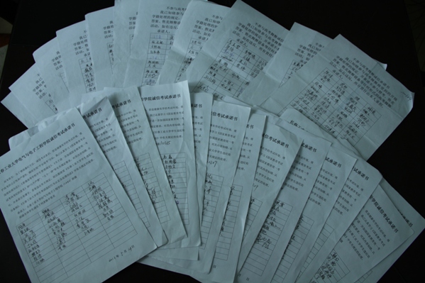系列活动之四:诚信考试,拒绝舞弊承诺书签署 各班级向广大同学提出诚信考试,拒绝舞弊的倡议,各班级的每一位同学都签署了诚信考试承诺书,承诺书上的每一个名字都是对诚信考试的承诺。