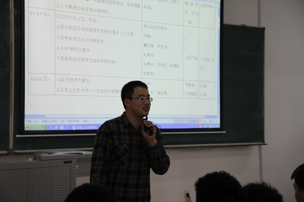 团委书记赵爽从思想政治教育、团学组织建设、校园文化建设、社会实践志愿服务工作等四个方面对上学期的学生会、社联、舍委会的工作进行了全面系统的总结,对同学们的工作成绩给予了肯定,对存在的不足给予指正,他希望同学们能在工作锻炼能力,发挥才智,勤于思考。最后,赵爽按照《长春工业大学共青团工作量化考核评价体系》和《长春工业大学团委2013年工作要点》的具体要求,结合新澳彩开奖直播