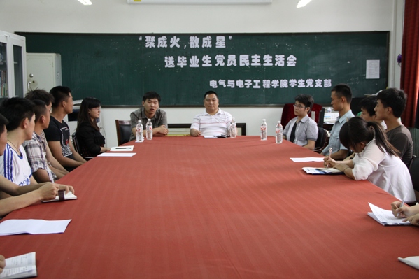 学生党支部在教学主楼1303教室召开“聚成火,散成星”送毕业生党员民主生活会,学生党支部书记郑洪斌老师和支部全体党员本次活动。