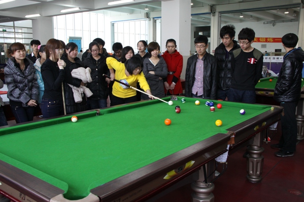 在我校南湖校区体育馆举办了别开生面的台球比赛。参赛的人员为2011级各班的实力战将。