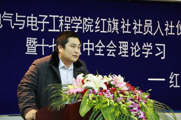 赵老师宣布新一届红旗社主要干部名单,并由红旗社相关负责人宣读红旗社章程及管理制度,会上郑老师向社员提出四点要求:学习过程长效性、学习内容广泛性、学习结果实践性、学习方法创新性,他还强调结合青年学生特点要坚持中国特色社会主义文化发展道路,全面贯彻党的十七届六中全会精神,提高大学生的文明素质,增强国家文化软实力,弘扬中华民族文化,努力建设社会主义文化强国贡献自己的力量。入社仪式结束后进行了十七届六中全会理论学习大会,在观看十七届六中全会的视频之后主持人介绍了我国文化产业的发展状况,回顾了党的十七大、十七届五中、六中全会的会议精神,最后由新社员上台讲述理论学习后的心得体会。