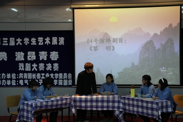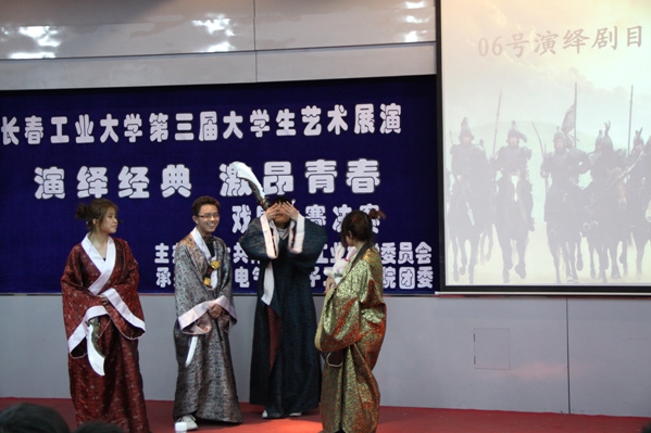 我校举行第三届大学生艺术展演系列活动之“演艺经典•激昂青春”戏剧大赛决赛 为了弘扬中华传统文化,传承百年戏剧艺术。由共青团长春工业大学委员会主办、我院团委承办的长春工业大学第三届大学生艺术展演系列活动之“演绎经典•激昂青春”戏剧大赛决赛于2011年4月11日18点30分在南湖校区综合报告厅如期举行。校团委副书记胡刃峰,我院党委副书记周文军及学生办公室全体老师出席。研究生新澳彩开奖直播