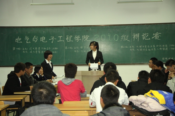 | 我院举行辩论赛决赛 2010年11月29日,我院在南湖校区教学科研楼612教室举办辩论赛决赛,比赛由校文艺部部长齐明洋、院社团联合会主席李佳俊、学生会副主席隋成阳、副主席柴源、舍委会主任闫平、辩论之星协会会长赵岩担任本场比赛的评委。