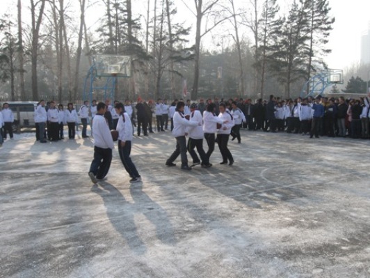 党委副书记周文军、学生党支部书记赵爽、辅导员高博、朱博老师以及学生会主席董丰嘉和社团联合会主席朱成龙观看比赛。 09级按照班级作为参赛队进行抽签,比赛共分为3个小组进行淘汰赛,参赛选手勇猛拼搏,裁判公正评断,助威同学高声呐喊,氛围浓厚而又热血沸腾,选手们两人为一组,步调统一,快速推进,充分体现了团结合作,互相帮助的协作精神。在场老师为获得本次趣味接力赛的前三名090309班、090302班和090312班颁发奖状。