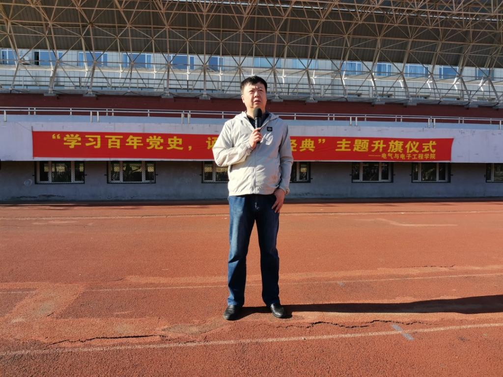 会议第三项:我院党委副书记矫东海发表重要讲话表达了同学们学党史的同时需坚定信念,在党的正确领导下,实现中华民族的伟大复兴。