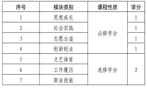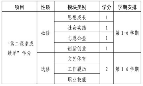 学校紧紧围绕学校人才培养目标,结合学生个性成长需求,“第二课堂成绩单”制度的实施基础,采用“1+X”模式“1+X”课程项目模式。“1”为必修模块,主要包括思想成长、社会实践、志愿公益、创新创业等 4个类别。X 为选修模块,主要包括文艺体育、工作履历、职业技能等 3 个类别。