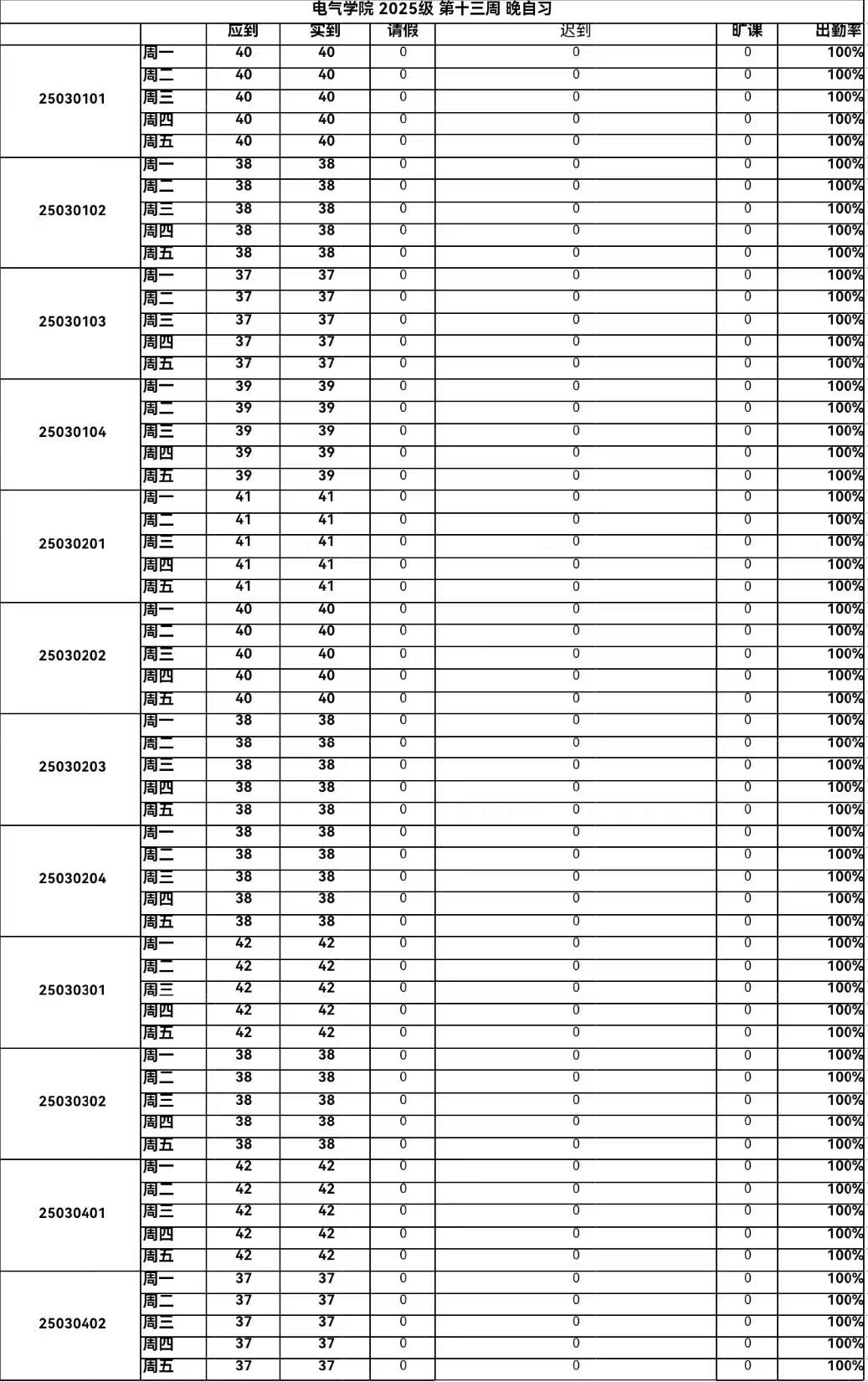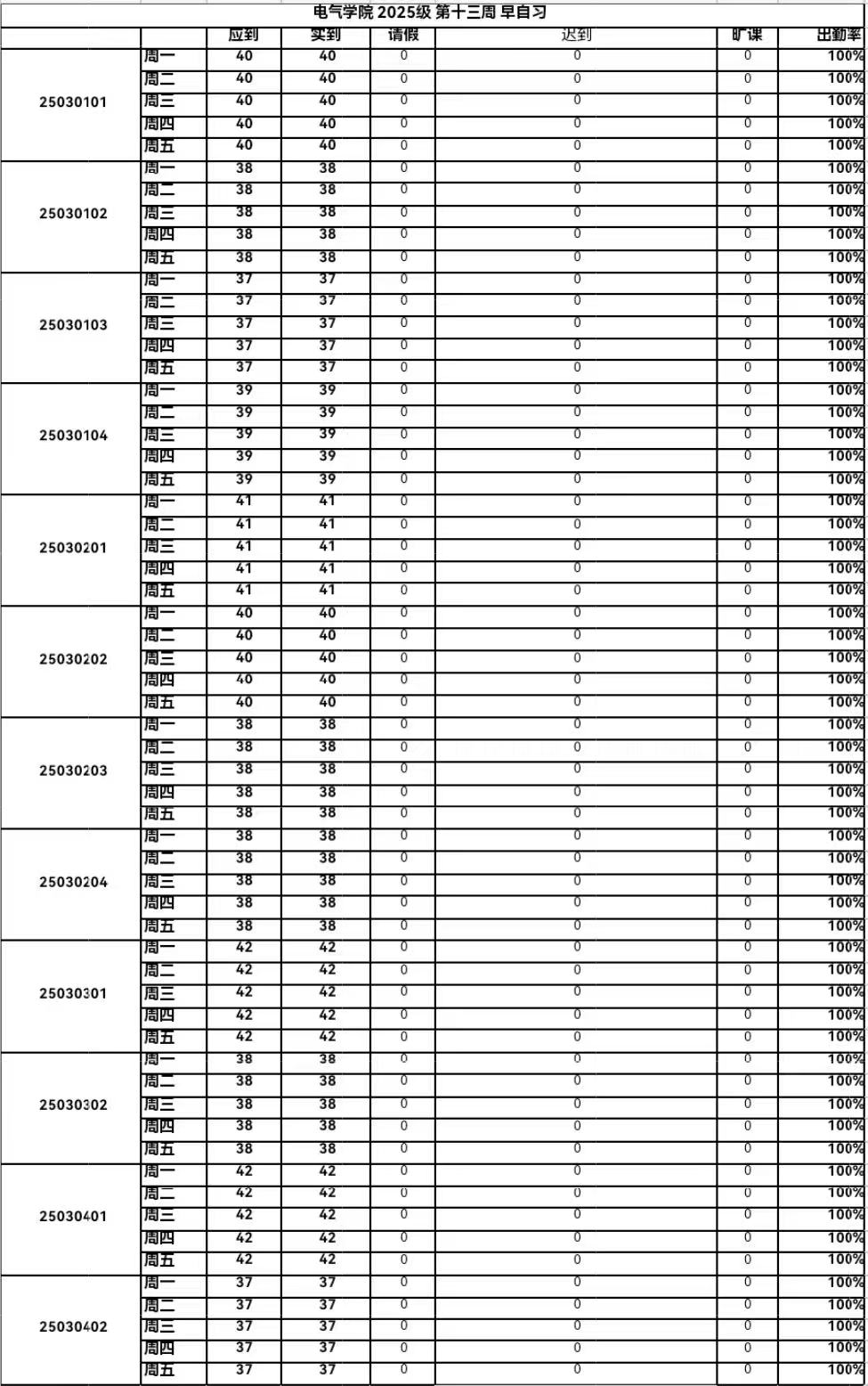 近期通过强化制度管理,有效提升早晚自习出勤率,为学生成长成才筑牢基础。第13周早晚自习出勤率已统计完毕,特此公示。