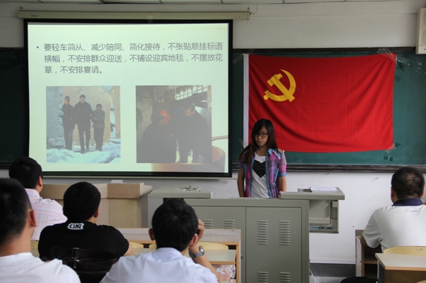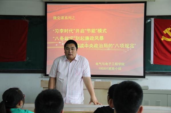 (通讯员 尹宏业)为了进一步学习和贯彻习近平总书记在中共中央政治局提出的关于改进工作作风、密切联系群众的八项规定。提高同学们的政治素养和思想觉悟,6月18日中午,学生党支部于主楼1401开展微党课系列活动之“习李时代”开启“节能”模式“八条规定”刮起廉政风暴 --解读中央政治局的“八项规定”理论学习活动。学生党支部书记郑洪斌和10、11级的所有入党积极分子、党员参加了活动。