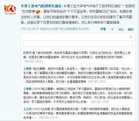 雷锋精神代代相传的缩影是雷锋精神不断的被赋予时代新意,不断的丰富雷锋日记的内容,续写的是日记,更是一份精神的传承;留下来的是美德,更是一个社会的希望。用有形的文字铸就丰碑,让正能量充满工大。最后,呼吁每一个工大人从自己做起,从身边小事做起,将每天都当做雷锋日。