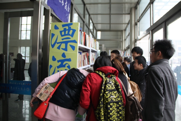 的同学。现场同学办理漂友卡并在借阅处登记借书。现场同学热情高涨,陈列的三个书架前“人满为患”。本次活动持续一个半小时,现场的火爆情景吸引来了吉林电视台守望都市以及长春日报、新文化报的记者,三家新闻媒体都对本次图书漂流进行了采访报道。