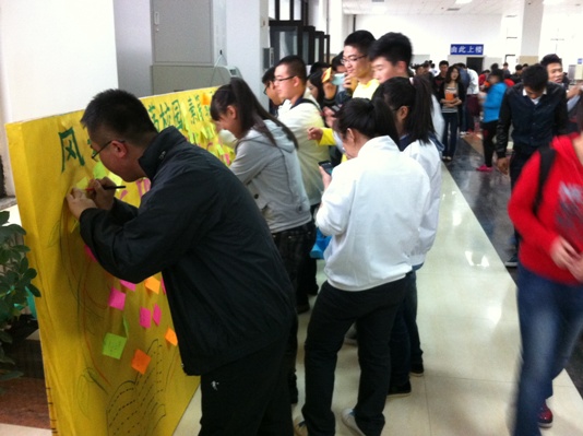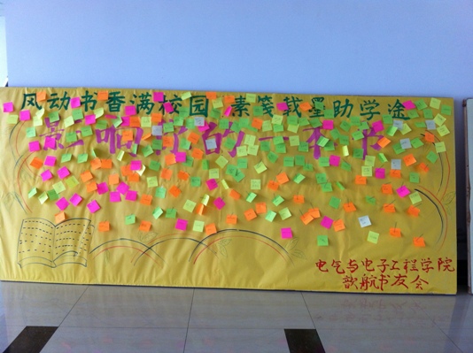 歆航书友会制作了巨大的展板,让过往的同学写下自己推荐的各类书籍。此次活动得到了同学们的广泛支持,展板上便密密麻麻的贴满了写有书籍名称的便利贴,或是曾经鼓舞激励过自己的励志读物,或是引领自己选择正确人生道路哲理散文,亦或是传递正能量的情感篇章,种类繁多。之后,书友会将同学推荐的影响工大人的一本书整理,供各位同学选择阅读。