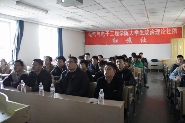 党委书记张学忠,党委副书记周文军,学生党支部书记郑洪斌、朱博,团委书记赵爽在我校教学主楼1401室同红旗社骨干成员共同观看了中国共产党第十八次全国代表大会的开幕式。