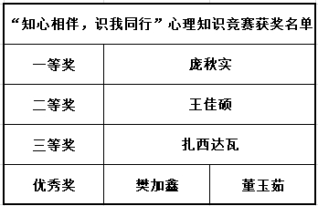 本次心理知识竞赛活动分为初赛和决赛。初赛在线上平台问卷星举行,规定时间内统一发卷答题。内容涉及心理学名词、心理健康和面对心理问题的方法等,密切结合大学生在学校学习生活中可能遇到的问题和情景,着重考察学生对心理知识的掌握情况和面对问题的解决办法。初赛共吸引100余名同学参与,经过选拔庞秋实,王佳硕,扎西达瓦,樊加鑫,董玉茹五位同学进入本次比赛的决赛。