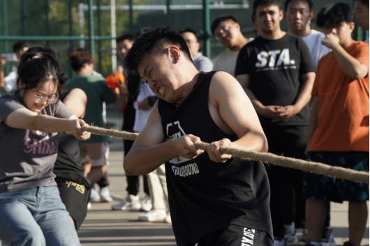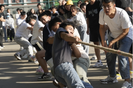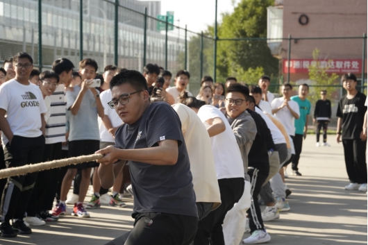 在体育场举办拔河比赛,新生们用行动诠释了团结就是力量,凝聚才能成功。