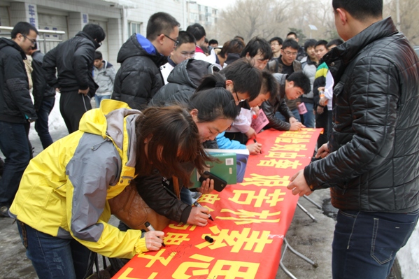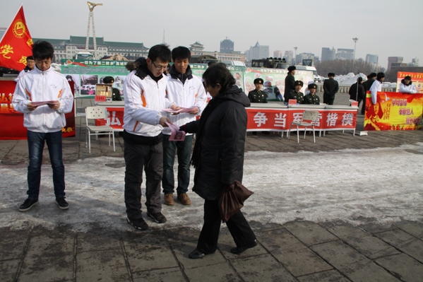大学生志愿者来到长春市文化广场,树起了“弘扬雷锋精神,倡导文明新风”的宣传海报,与吉林警备区的警务人员一起向路人宣传雷锋精神,并分发自制的雷锋精神宣传单。活动吸引了众多媒体的目光,吉林日报等几家媒体对大学生志愿者进行了采访。在接受访问时,同学表示学习雷锋精神是大学生应上的一堂课,宣传雷锋精神是大学生应尽的义务,同学们会在日常生活中多做好事、实事,尽己所能为需要帮助的人伸出援助之手。