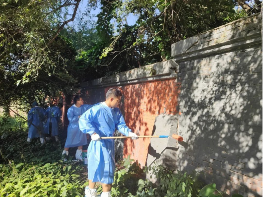 在志愿者还未粉刷时,墙面整洁度较差,墙体原有色彩灰暗。志愿者们一上一下的挥动着手中的粉墙刷,认认真真的为墙面刷上红色颜料,原本灰暗的墙面逐渐变得成一面崭新的红墙,尽管身上被颜料染的一塌糊涂,仍掩盖不住大家志愿劳动背后的快乐。南湖新村居民在经过粉刷现场时感慨:“粉刷后,墙面变得更加鲜艳,恰好和秋天的氛围相搭配,感觉经过这里的心情都有所改变。”