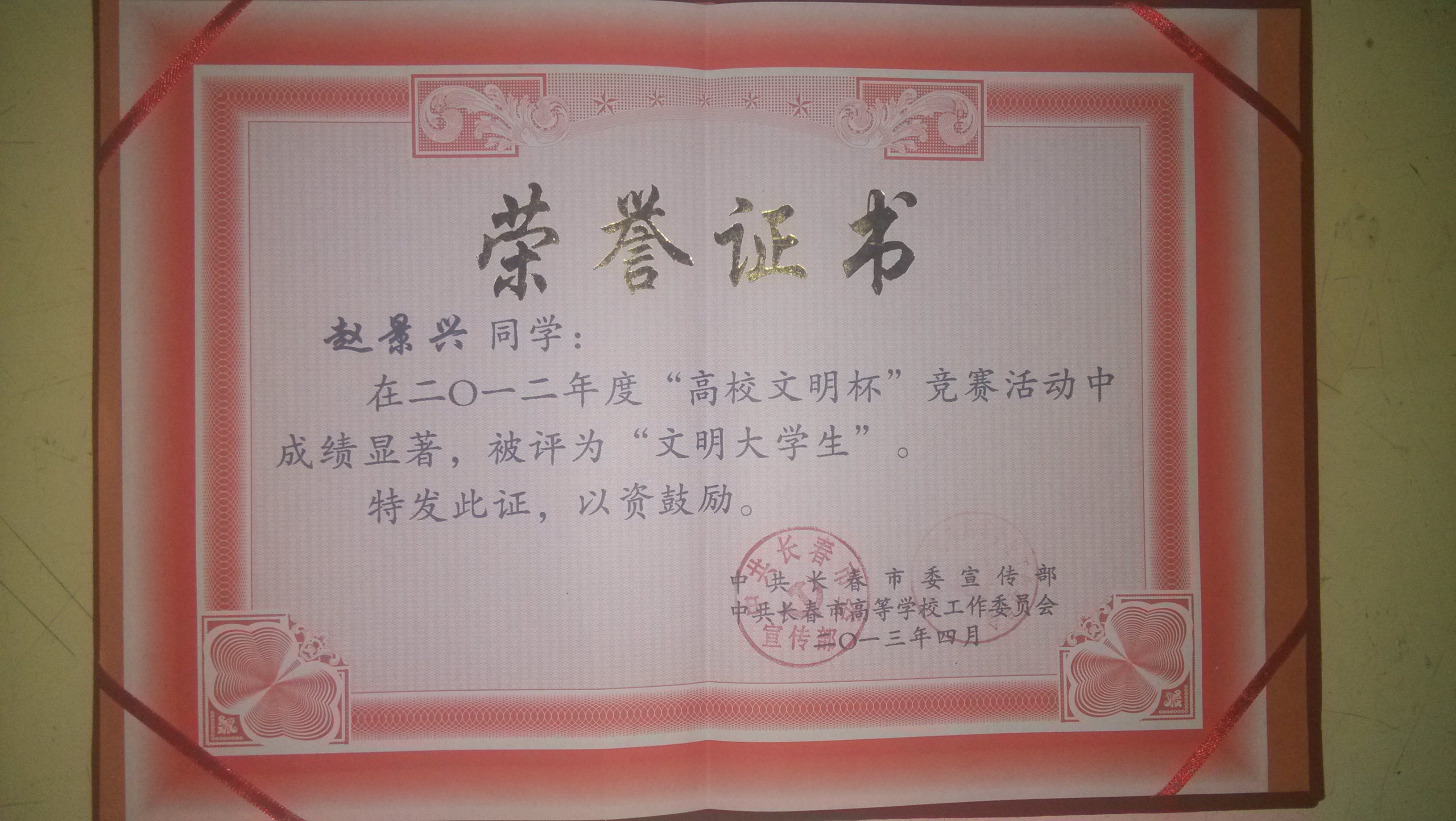 我院赵景兴获长春市“高校文明杯”竞赛活动文明大学生荣誉称号<