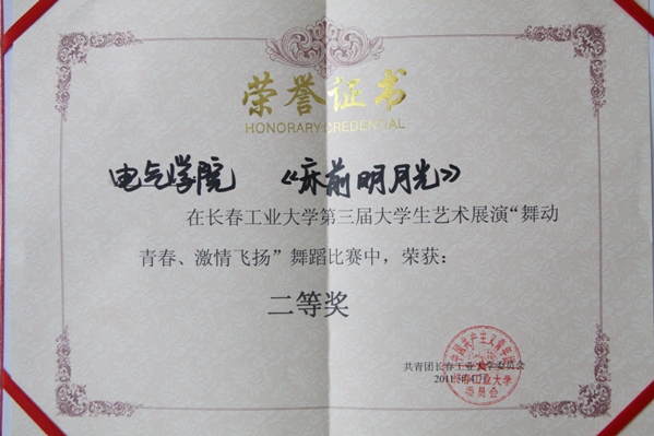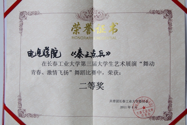 我院选送的《秦王点兵》《床前明月光》获得长春工业大学第三届大学生艺术展演系列活动之“舞动青春激情飞扬”舞蹈比赛中获得二等奖。