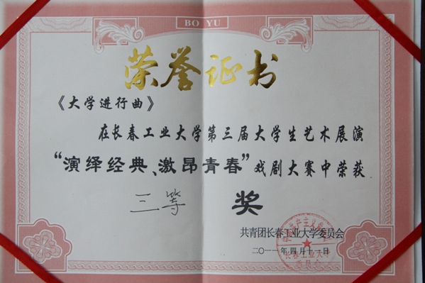 我院选送的《大学进行曲》、《梦想召回现实》获得长春工业大学第三届大学生艺术展演系列活动之“演艺经典激昂青春”戏剧大赛决赛三等奖、优秀奖。