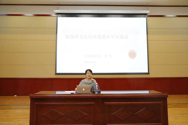 教授、博士生导师夏雪作了题为“加强研究生科学道德和学风建设”的专题报告。从研究生科学道德和学风建设“是什么”、“为什么”以及“如何加强”三个方面,指出当代研究生加强科学道德及学风建设的重要性,并引用了国内外学术不端的例子告知同学们如何正确遵守学术界的标准,切勿抄袭剽窃他人文章、一稿多投、伪造或篡改实验数据等,希望同学们高度重视科学道德与学风建设,在科研道路上不断加强自身学术道德修养,牢记新时代高层次人才身上的重任,要坚守学术诚信,维护学术尊严,摒弃学术不端,以优良的学风全身心投入到学习和科研事业中。
