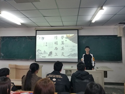 活动由院学生会副主席潘昱企主讲。首先,潘昱企给同学们普及了中国传统节日“清明节”的由来与习俗,提倡大家积极参与活动,缅怀先烈。随后,他向全体同学讲述了李大钊、刘胡兰、董存瑞、雷锋、金守儿等中国革命烈士的英勇事迹,并提议大家深刻悼念为了民族与国家而壮烈牺牲的烈士们。潘昱企认为,在中华民族面临生死存亡的危险时刻,是烈士们用自己的血肉之躯筑起了长城;是烈士们抛去了个人的一切,挺身而出,坚强而决绝,与敌人斗争;是烈士们将宝贵的生命无私地献给了祖国和人民,把满腔的热血洒遍祖国大地。他希望在座全体同学能够继承先烈遗志,努力学习,担负起属于当代青年应尽的责任。