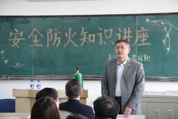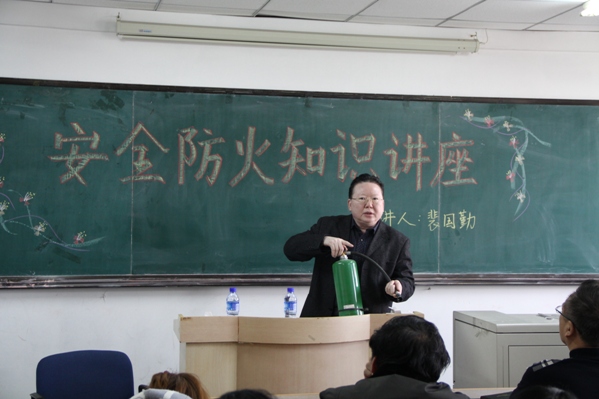 党委书记张学忠主持。裴老师结合近年来的火灾案例,就消防平常检查、遵守以及疏散逃生的基本常识、消防火灾的应急和预防、消防器材的正确使用方法进行了深入浅出的讲解。讲座中,裴老师结合高校内发生的火灾案例,用“血的教训”警示全体教职员工高度重视消防安全,不断增强消防安全意识,加强消防安全管理,积极主动做好自己负责的教研室和实验室的消防安全工作。