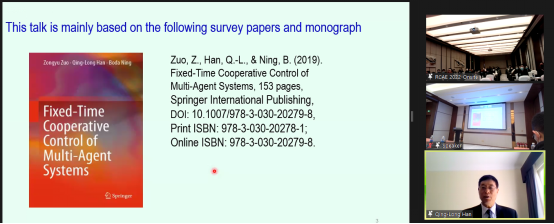 院士、澳大利亚斯威本科技大学韩清龙教授作了题为Fixed-Time and Prescribed-Time Cooperative Control of Multi-Agent Systems的主旨报告